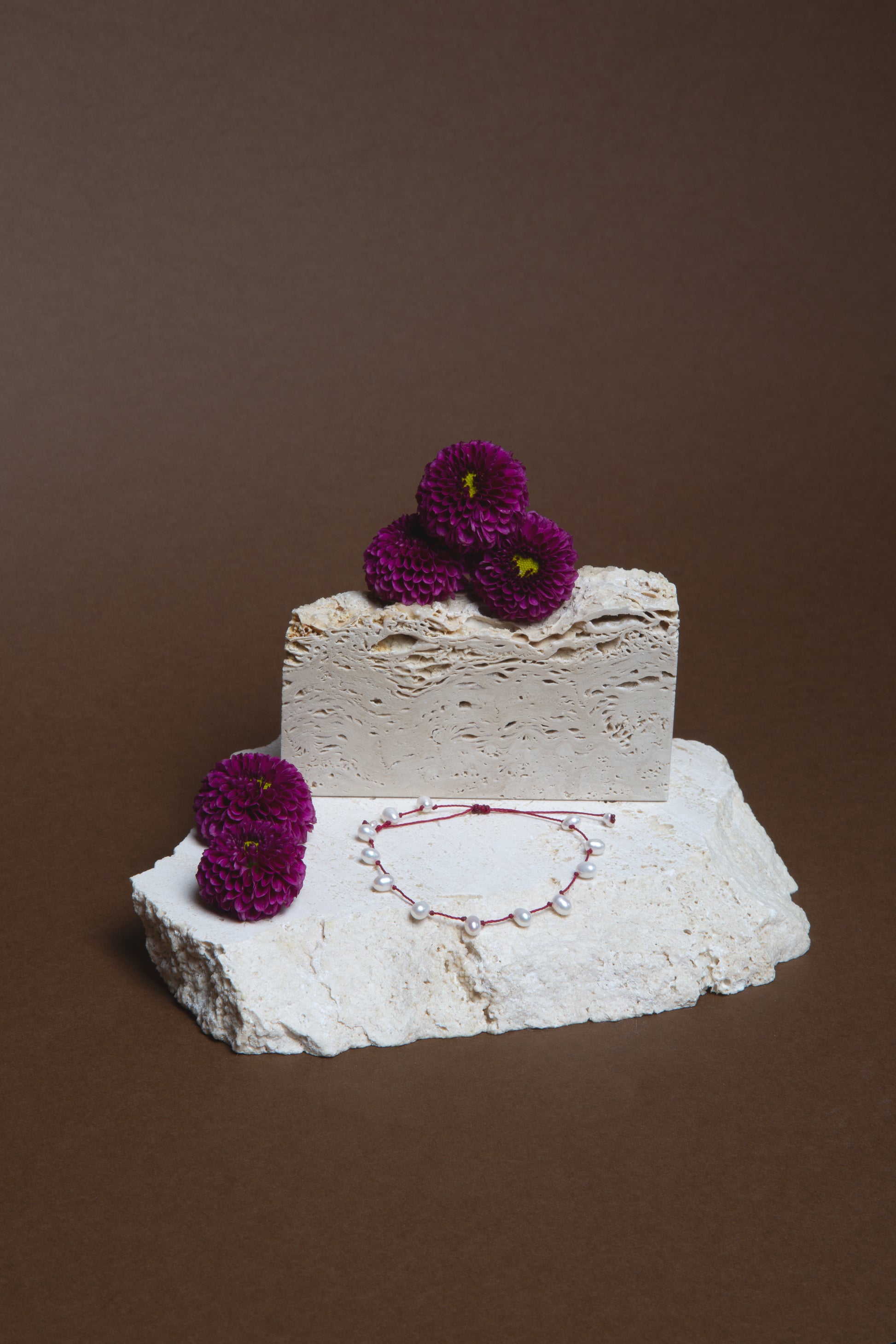 Braccialetto regolabile con perle bianche di media misura e filo rosso.