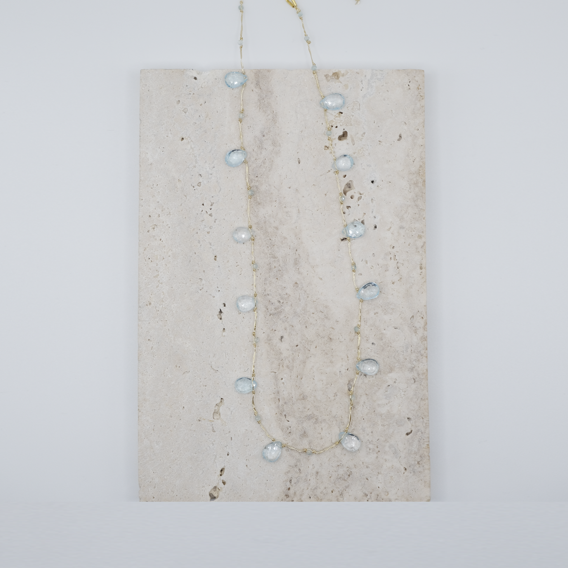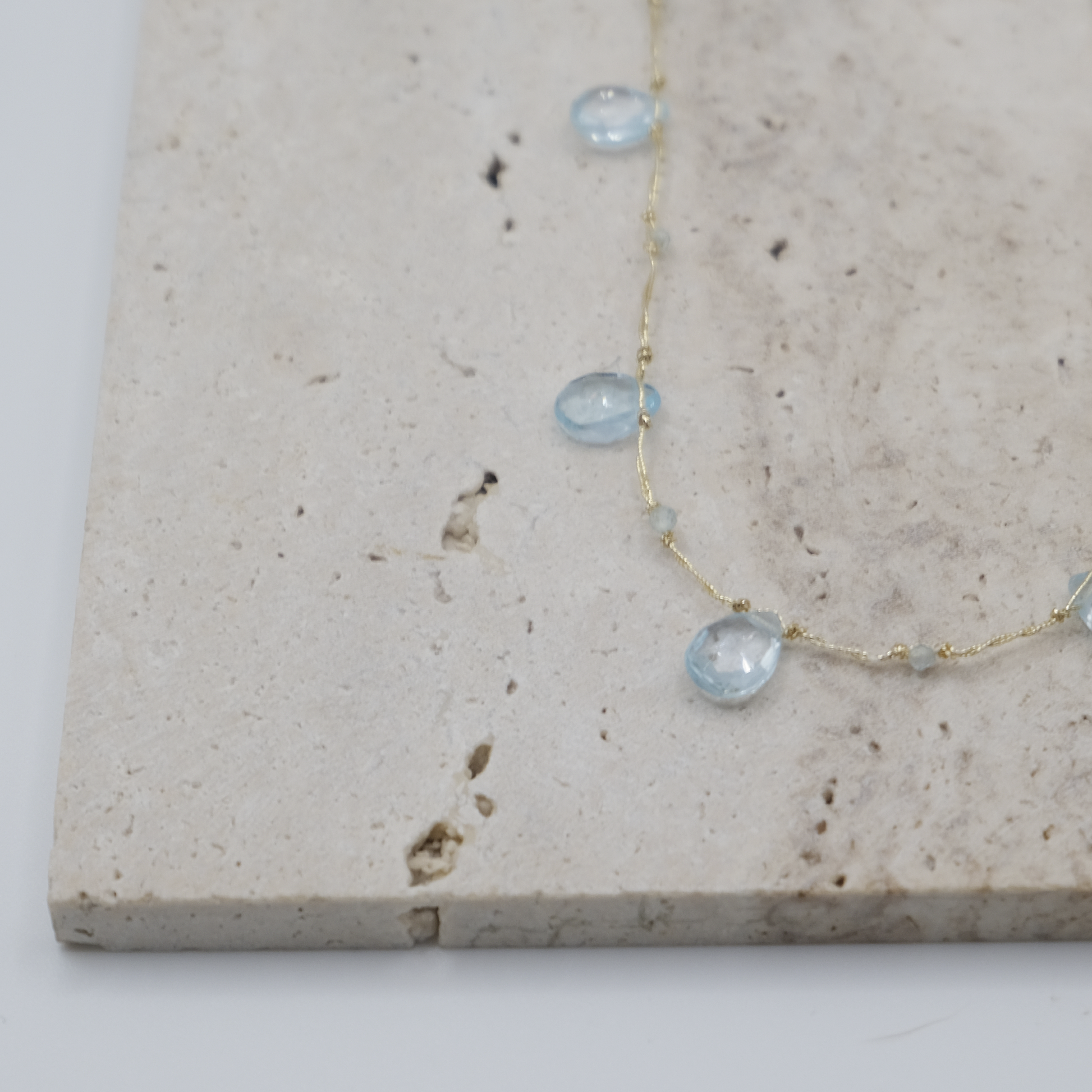 Collana regolabile con filo color oro e gocce sfaccettate di acquamarina, chiusura in argento 925 placcato oro. Pezzo unico.