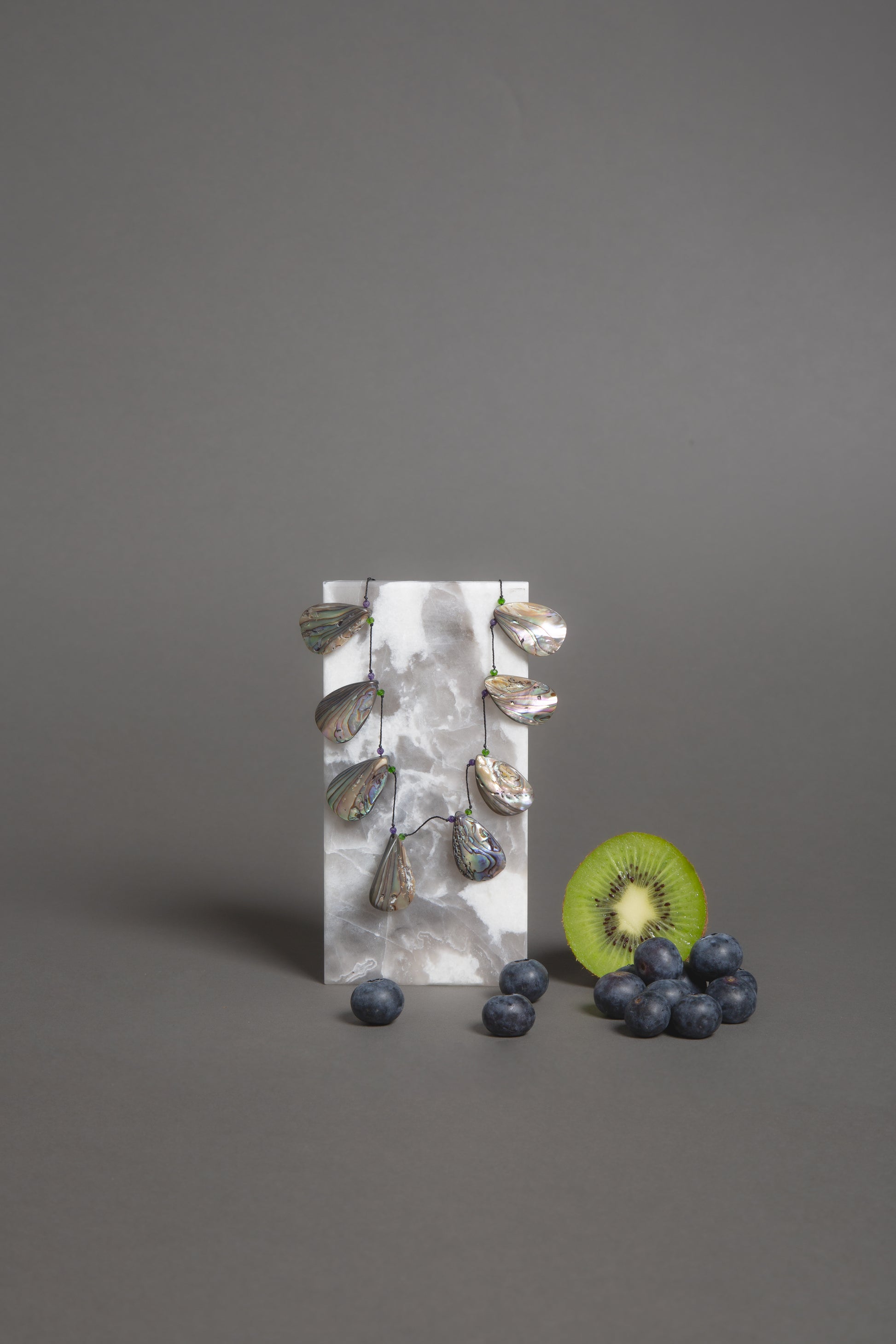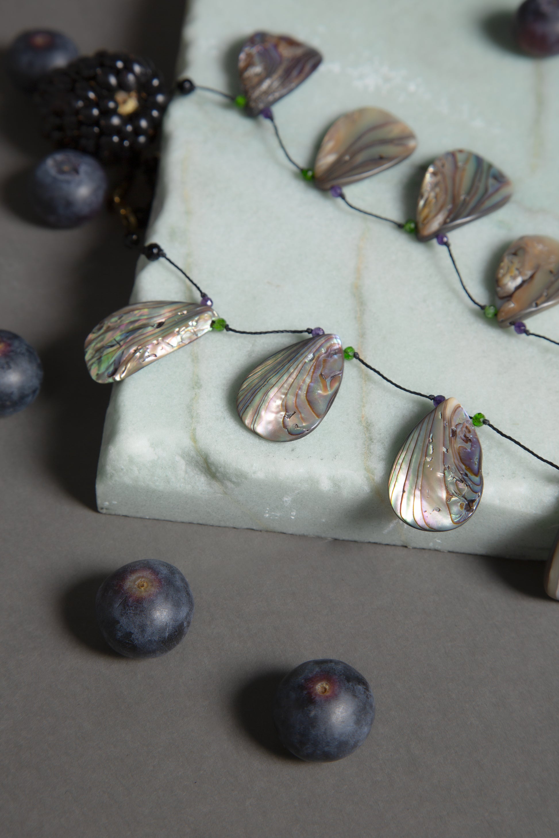 Collana a gocce grandi di madreperla nera e piccole pietre di ametista e malachite. Chiusura in argento 925 regolabile in lunghezza.
